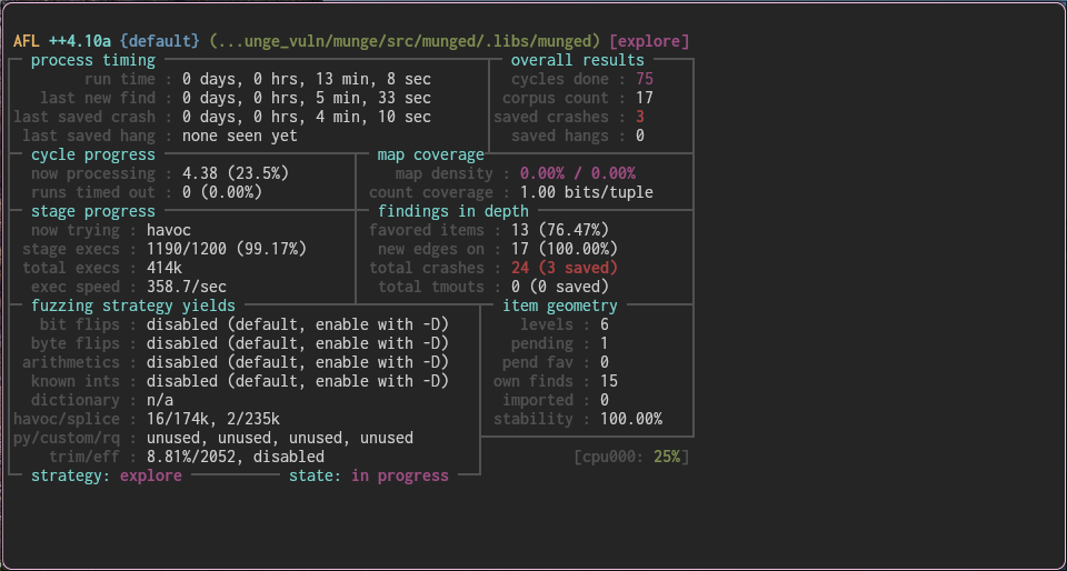 When reading through the documentation provided by our customer on the first day of the assessment, Munge appeared to be one of the most critical component of the HPC. After a quick look at its source code, the auditor decided it was worth investigating. Because a whole pentest still had to be done, and after a discussion with another colleague, it was decided to use AFL to fuzz Munged message parsing and encoding/decoding routines. It did not take too much time to produce a harness by simply copying the job_exec function of munged into main.