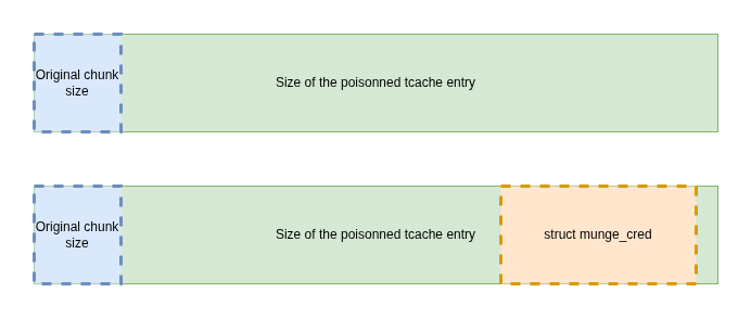 Using this primitive, attacker can completely shape the heap, and populate tcache of multiple size. The heap is then shaped as follows: