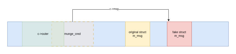 Later in the enc_process_msg, during the function enc_pack_outer, the realm part of the token will be copied from the message, to outer buffer. outer is allocated on the heap right before the cred struct. Because it is a fake chunk with fake size it overlaps the credential struct, meaning that, at this point, the attacker gains control over the cred struct. This allows the attacker to replace the pointer to current message by a pointer to a fake struct msg.