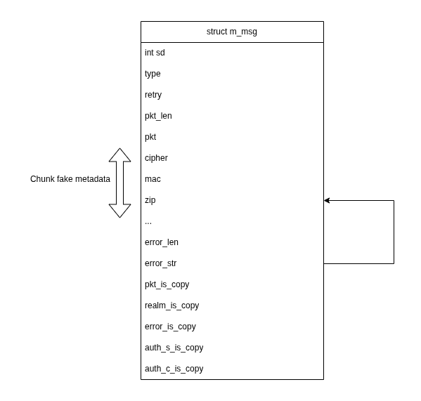 After leaking addresses of the main arena, it is possible to accurately craft a fake chunk right before the zone where m_msg struct are allocated. To do so, instead of a partial overwrite of the error_str pointer, it is overwritten completely and points to the computed address of the current m_msg. The current struct m_msg, holds user provided data, copied during the unpacking. file: src/libcommon/m_msg.h